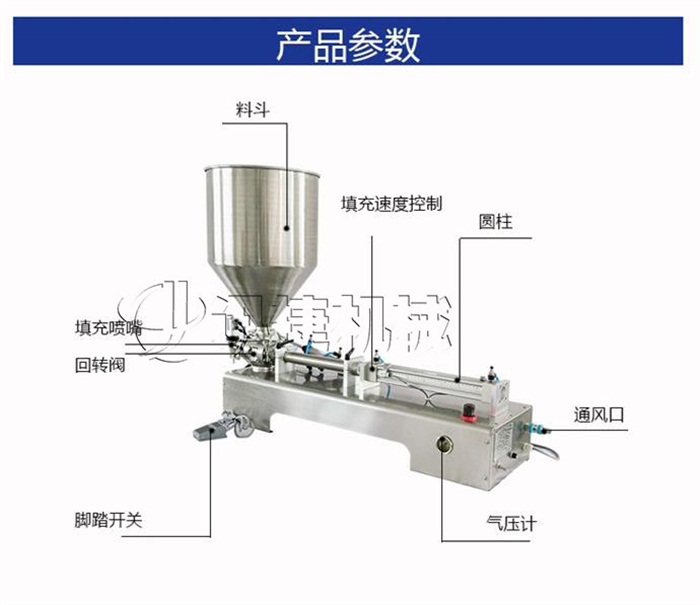3、該純氣動膏體灌裝機為全氣動控制機型,該膏體灌裝機缸體、機殼、料斗均由不銹鋼材料制成。