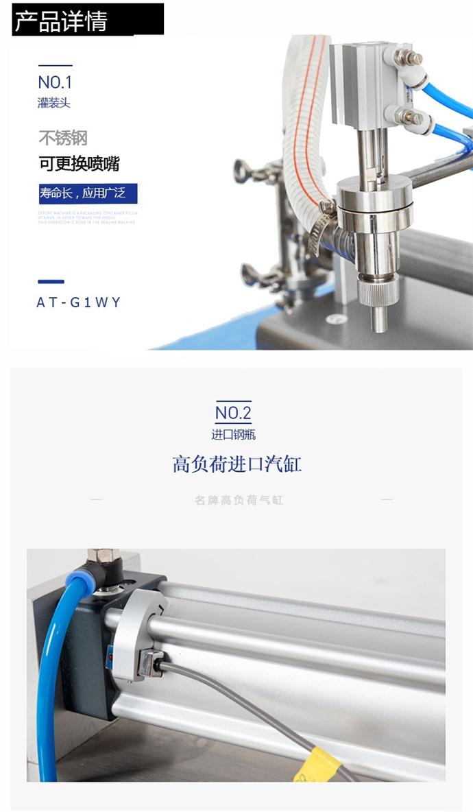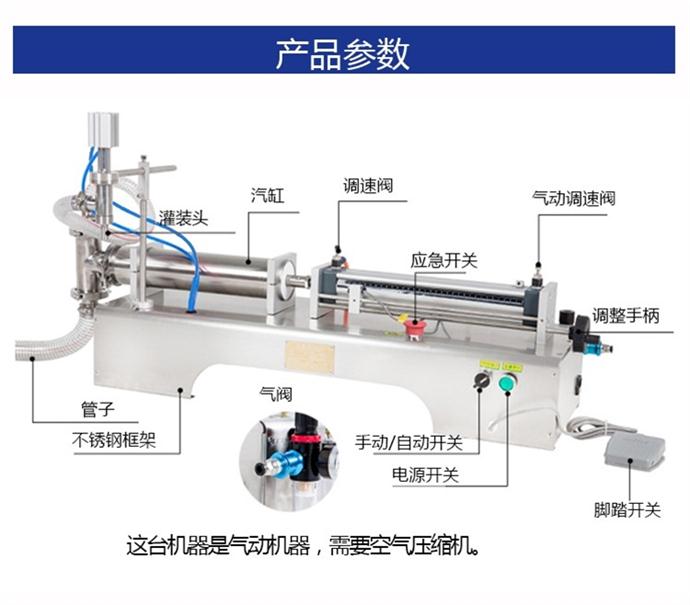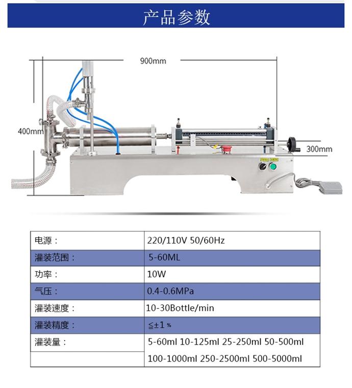 單頭活塞式液體灌裝機DY ( 60/12/250/550/1000/2500/5000 )系列灌裝機半自動活塞臥式液體灌裝機 一工作原理: DY 系列灌裝機為半自動活塞式灌裝機,通過氣缸帶動一個活塞